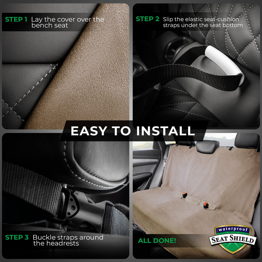 UNIVERSAL FIT AND EASY INSTALL: Fits all bench-style backseats with headrests. Simply lay the cover over the bench-seat, attach the two top buckle-closure straps around the headrests, slip the two elastic seat-cushion straps under the corners of the seat-bottom, and you're all set! Unlike bulky canvas covers, our seat cover is light-weight and easy to fold and store when needed. Compatible seatbelt covers available separately.